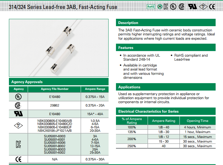 力特保險絲314 系列 - 3AB快熔陶瓷管介紹: