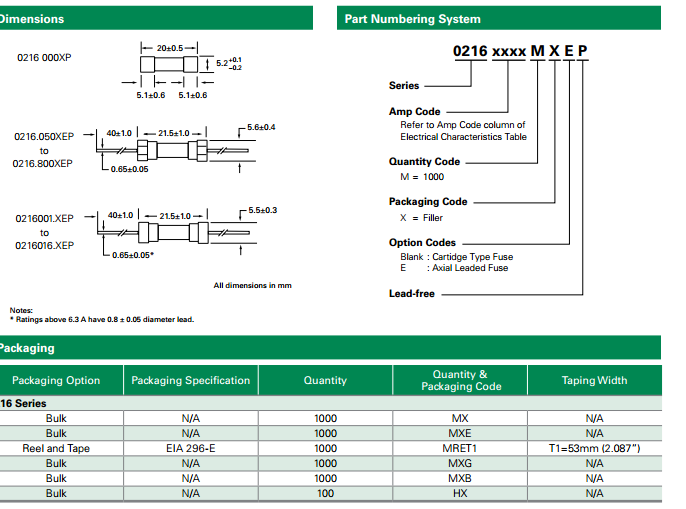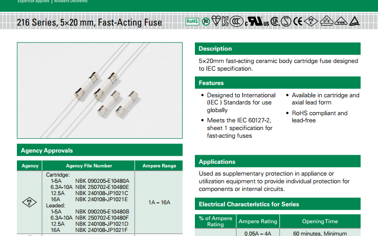 力特216 系列 - 符合IEC規(guī)范的5x20mm快熔型陶瓷管保險絲: