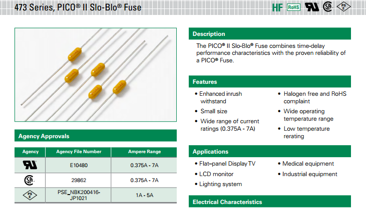 力特保險(xiǎn)絲473 系列 - PICO? II Slo-Blo超小型軸向引線式保險(xiǎn)絲詳細(xì)介紹:
