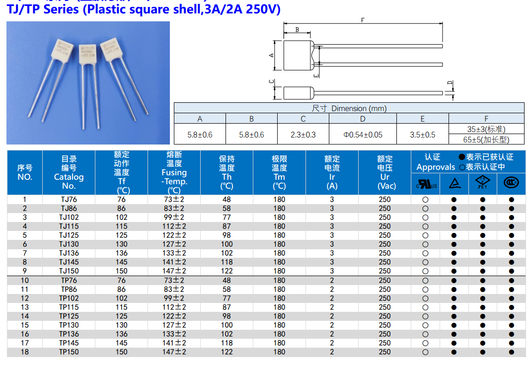 方形溫度保險絲:TJ/TP 系列 (塑膠方形,3A/2A 250V)