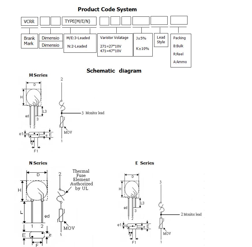 ?壓敏電壓從(18V-1800V) ?具有UL ,TUV認證,符合RoHS,Reach標準,無鉛 ?專利的集成熱保護裝置 - ?旨在促進符合UL1449第3版SPD產品 ?和促進符合IEC62368 ,IEC61643-331產品 ?高峰值浪涌電流額定值高達10kA ?波可焊 ?標準引線形式和間距選項 ?低泄漏 ?-55°C至+ 85°C的工作溫度范圍