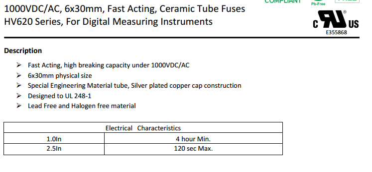 6x32mm尺寸的1000V熔斷器, 為數字儀表在CAT II/III下誤操作提供保護.